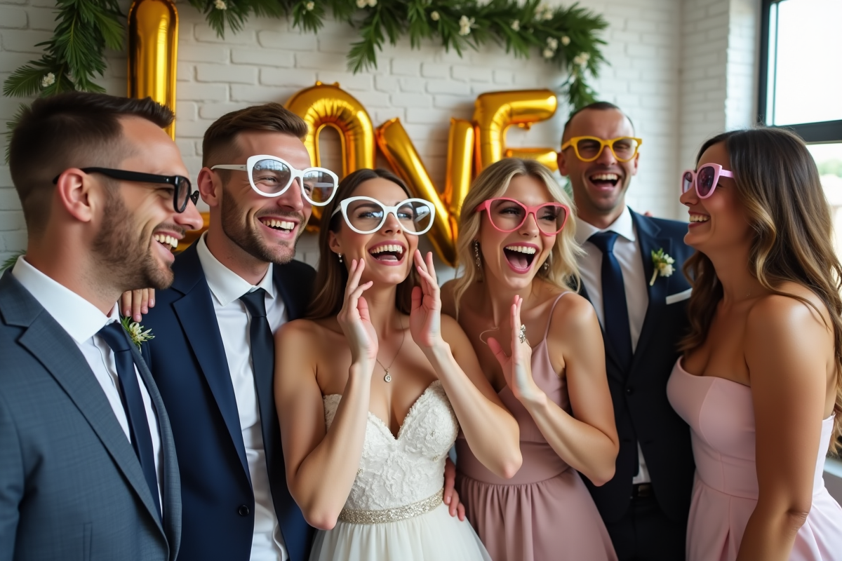 Les accessoires photobooth sont la clé pour libérer l’imagination des invités. Chapeaux, lunettes fantaisie, moustaches sur tige, cadres dorés ou en bois : tout est permis, à condition d’offrir du choix. Pensez également aux panneaux directionnels, qui guident subtilement les invités tout en ajoutant une note décorative. Pour ancrer vos souvenirs dans le temps, créez un hashtag dédié, affiché près du photobooth : vos proches partageront leurs clichés sur les réseaux sociaux, facilitant la récupération de ces instants spontanés.